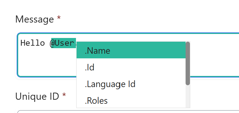 Unknown sub items of a certain IntelliSense object, like a variable object, a retrieved record, or an item in a for loop, you can directly type the logical name of the parameter or the attribute from the logic. For example: