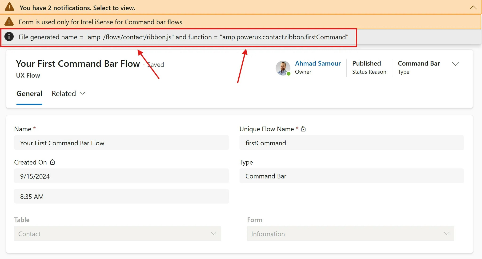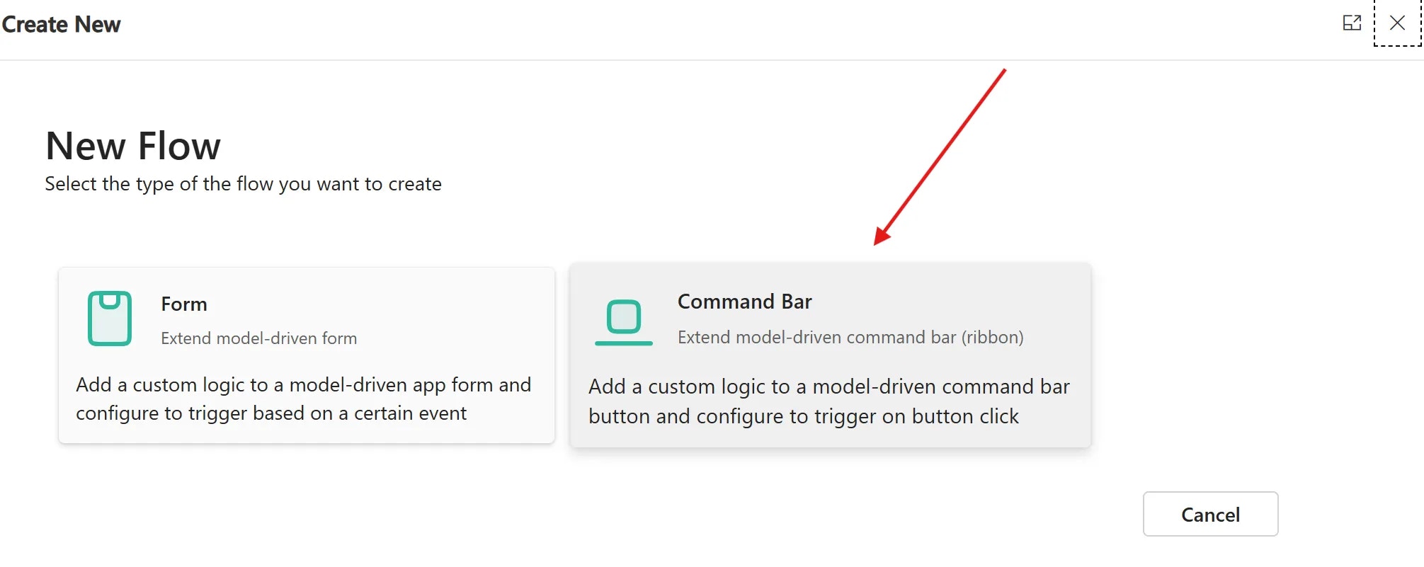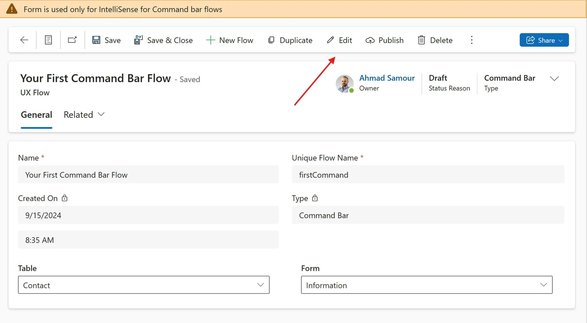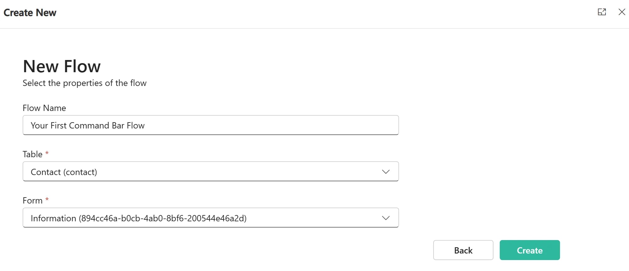 Set a name for the flow and then choose a table and a form for the command bar you want to extend.