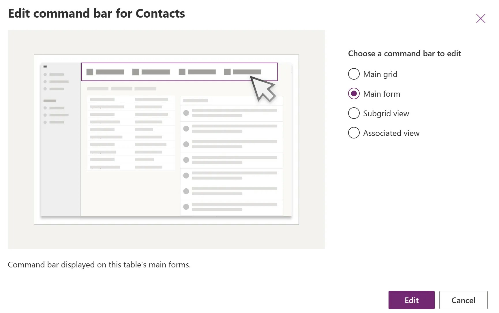 - Open the Command Bar designer and click Edit Command bar for the entity you want to extend